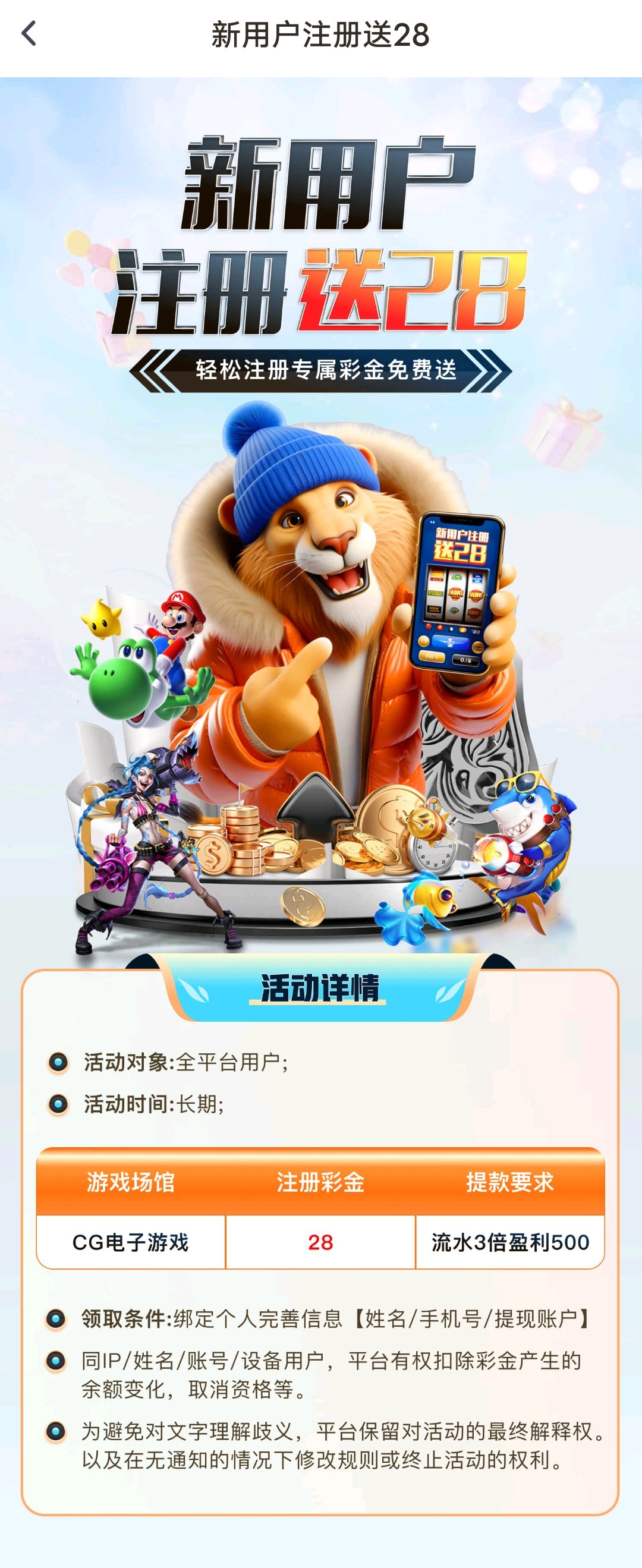 新用户下载注册完善信息,活动大厅自助申请,限制CG电子3倍500起提,赌神项目,有兴趣的试试,具体看活动介绍。
